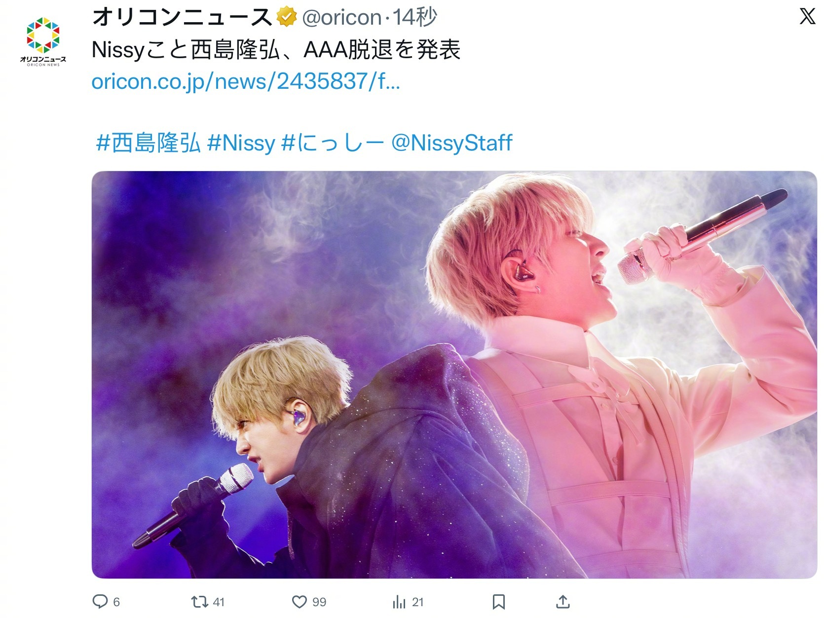 先锋娱乐网讯www.10go.com 2月11日,男女混声组合AAA成员Nissy(本名西岛隆弘,39岁)通过个人官方Instagram宣布正式退出组合。声明中说明,西岛日前接受了第四次喉部手术,虽持续观察恢复状况,但由于病情长期积累,本次需要相对较长时间的治疗与休养。
