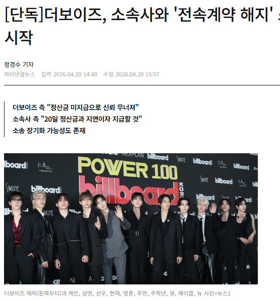 在20日于首尔中央地方法院民事合议50庭审理的首次辩论中,THE BOYZ方面代理人向法庭请求:“与该专属合约的信任关系已无法恢复,为了稳定的活动,请尽快引用假处分申请。”该事件始于今年年初。THE BOYZ成员中除NEW外的9名成员于2月10日向经纪公司通报解除专属合约,距签订合约仅1年3个月。解约理由包括:未支付2025年第三、四季度结算金;拒绝提供结算依据资料的查阅请求;违反管理义务;未经告知擅自签订第三方合约等。经纪公司表示无法接受,THE BOYZ方面于上月23日提交诉状。